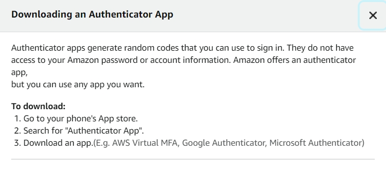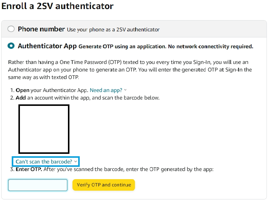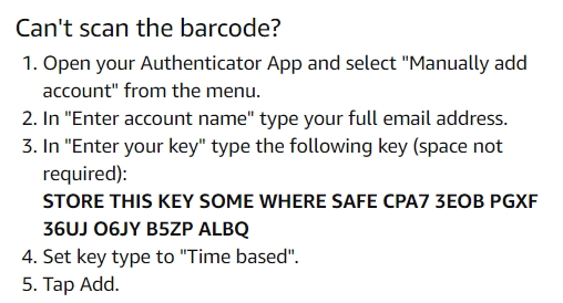 Then on the next page, click Get StartedClick the Authenticator App option and click Can't Scan the Barcode