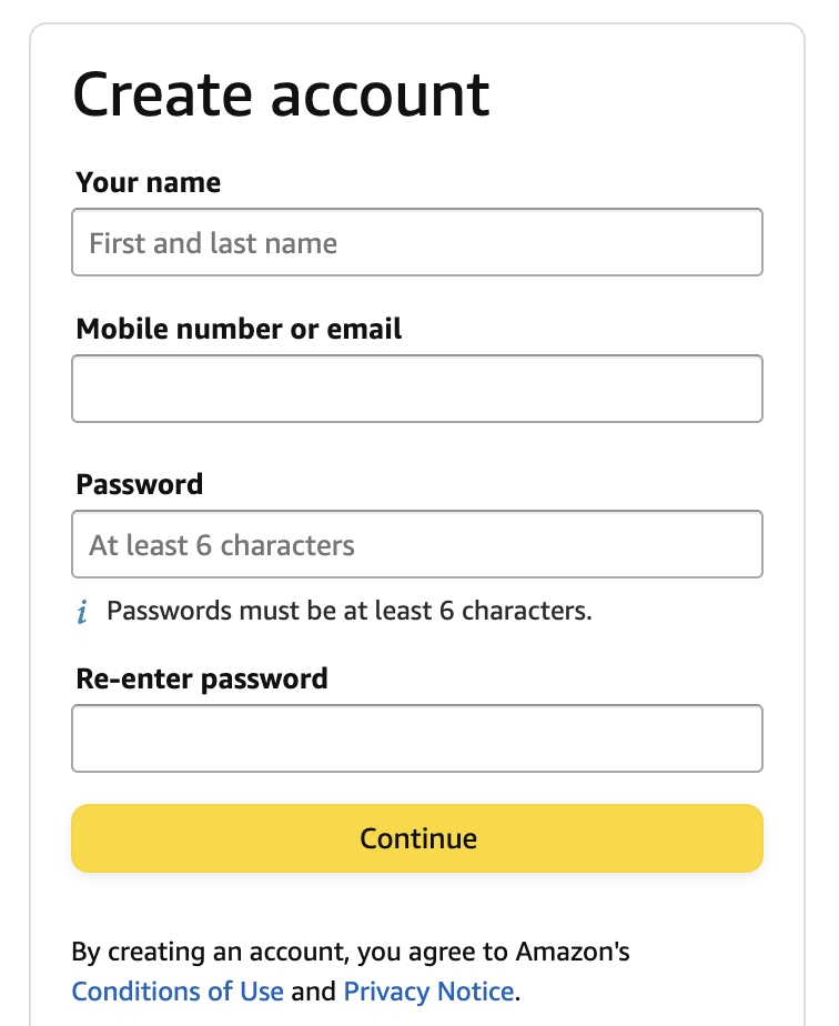 Click on "Continue": After entering your name, email address, and password, click on the button labeled "Create your Amazon account" or "Continue". If presented with continue, you may need to receive a OTP code sent to the email of your new account.