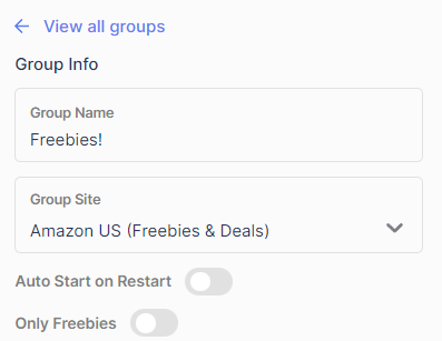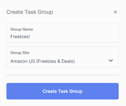 3. After click the creation button, a window will open where you can name your task group and choose the site. In this case, the group site should be `Amazon US (Freebies & Deals)`