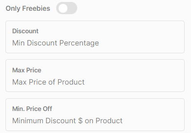 1. `Min Discount Percentage` is the minimum discount you want to go for. For example, if you want products that are only 90% off or above (including freebies), put 90.