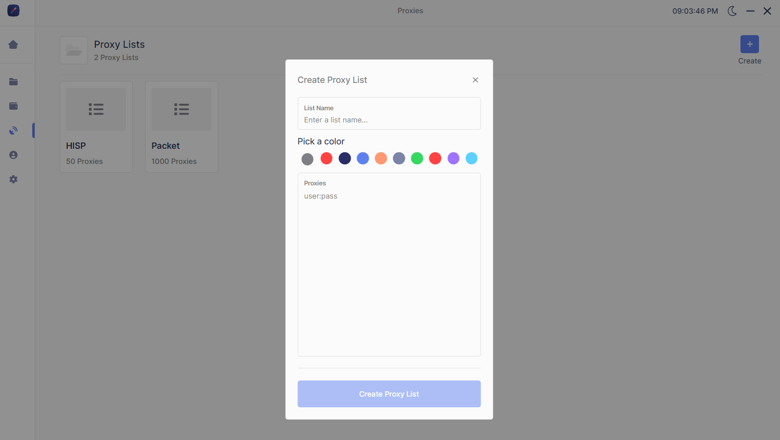 2. Once in the proxy list tab, you will want to create a new list by clicking the `Create` button in the top right hand corner. A proxy creation window will open up where you will name your list, choose a color (optional for ease of use) and paste your proxies.&#x20;