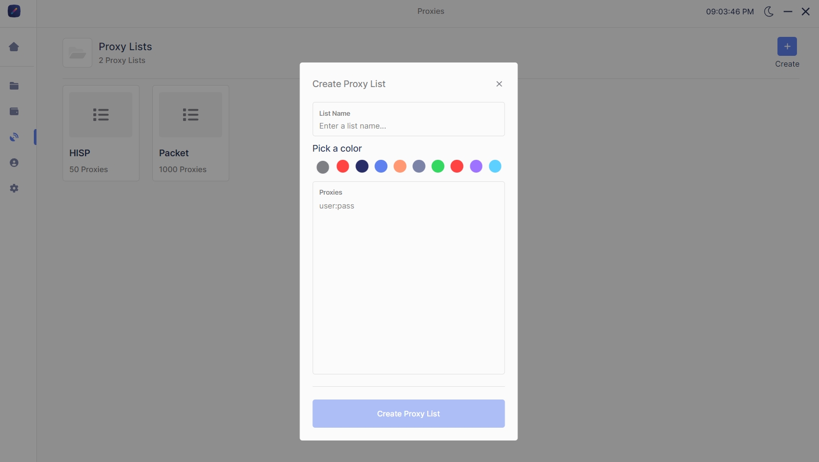 Createbutton in the top right hand corner. A proxy creation window will open up where you will name your list, choose a color (optional for ease of use) and paste your proxies.
