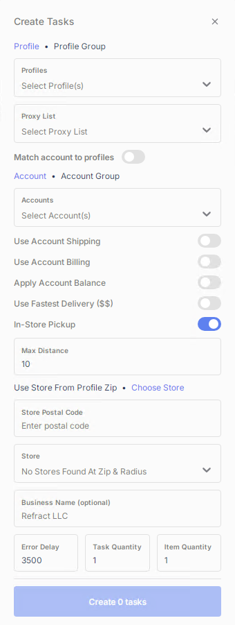 * **Max Distance:** Defines how many miles from the profile ZIP code the bot will search for or select stores when a maximum distance is set.