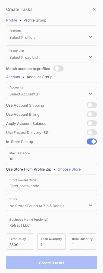 If the Apple waiting room page is live, store data cannot be fetched. When creating tasks during this time, use the billing ZIP code and search radius to determine available stores.